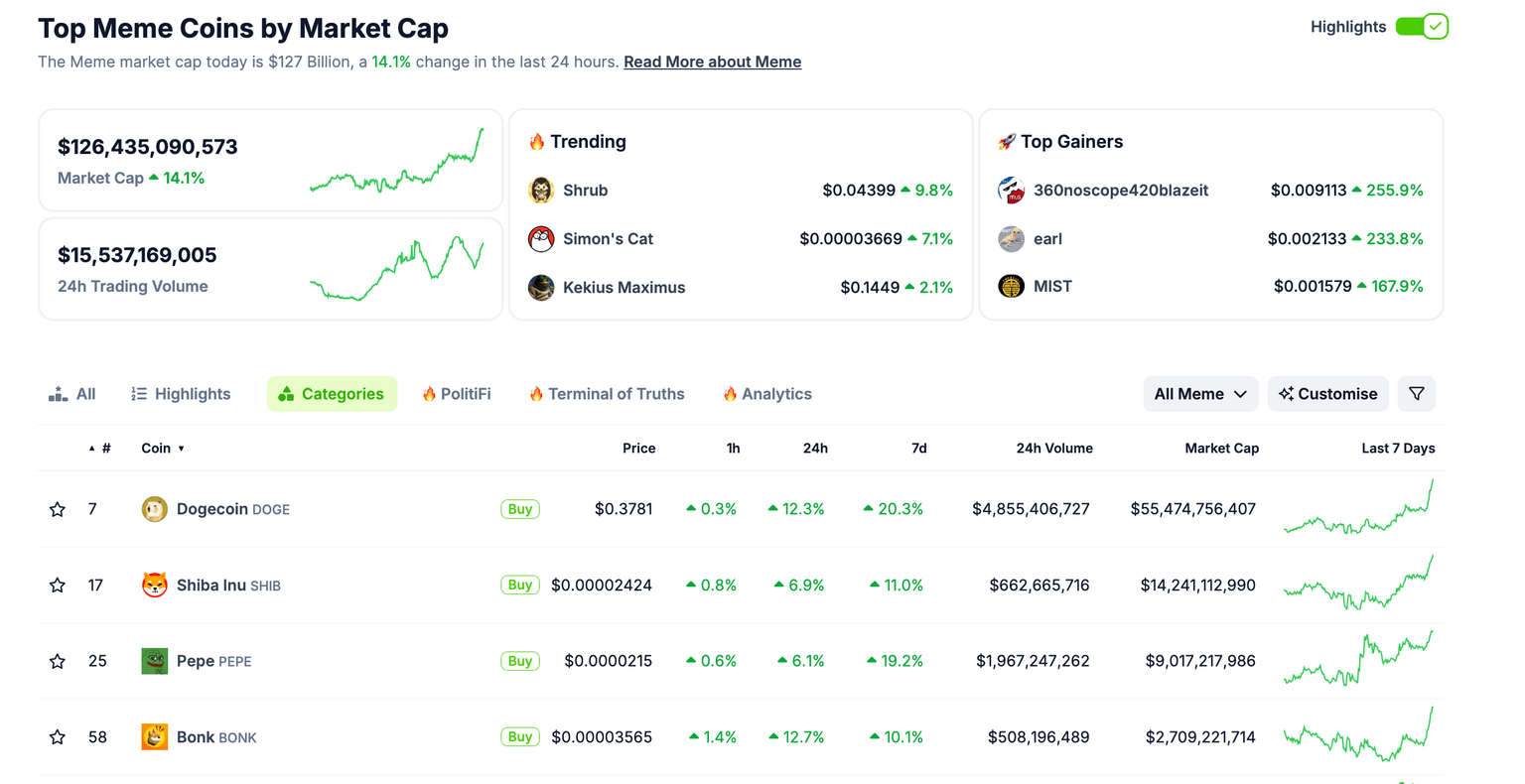 Other mega cap memecoins like Dogecoin (DOGE), BONK, and a16z all also experienced notable gains.