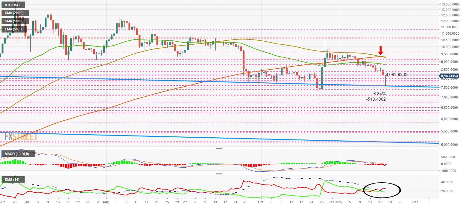 - BTC/USD falls 3.65%, recovering from session lows of $8,081. The remaining margin falls above 6% to the key target of $7,569.