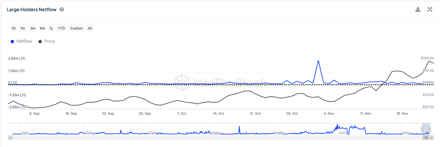 The IntoTheBlock chart above shows that Litecoin whales have recorded positive net flows since September 14. In the 73-day buying spree, the whales have acquired 13.2 million LTC, at the average price of $946.6 million.