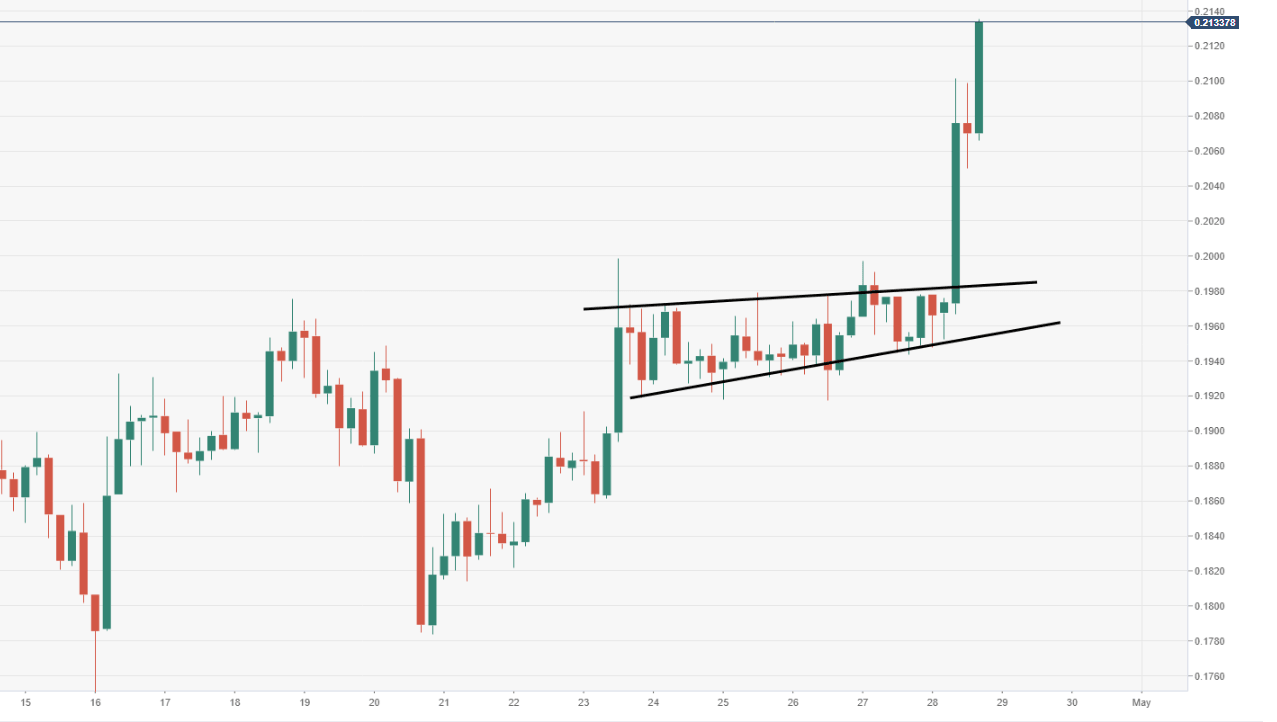 XRP/USD is currently trading at $0.21 (+7.70%), a huge surge in momentum came into play, following the bulls breaking out of a bullish pennant structure.