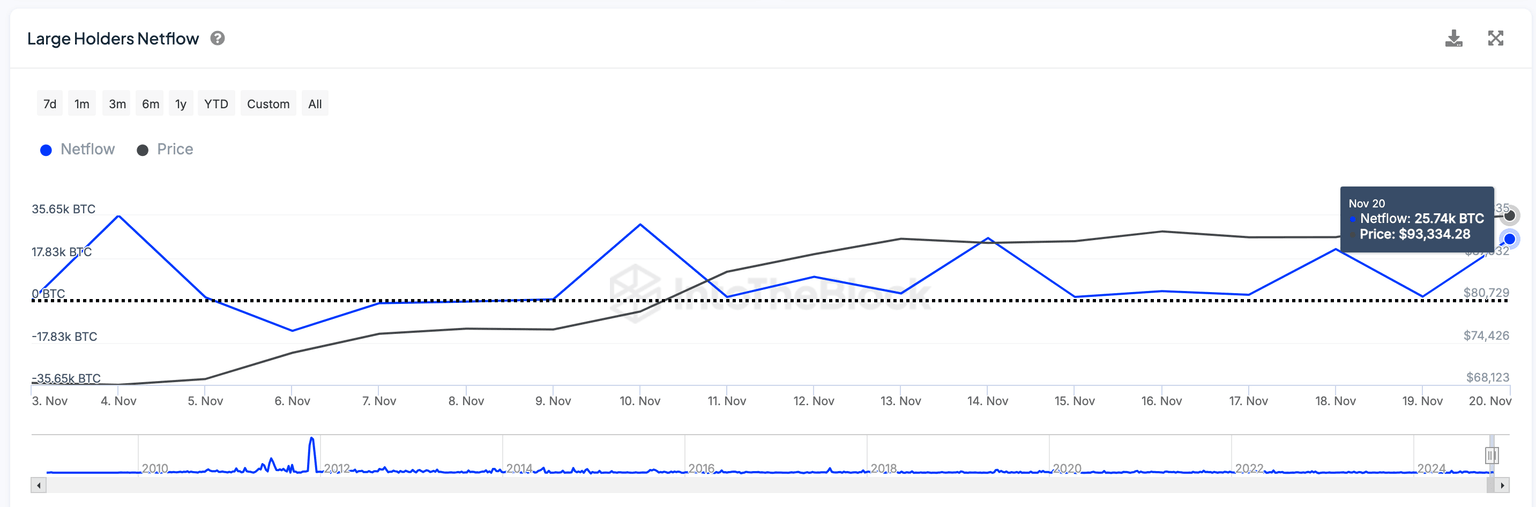 Zooming in, the whales have also recorded positive netflows in each of the last 12 trading days dating back to November 9.