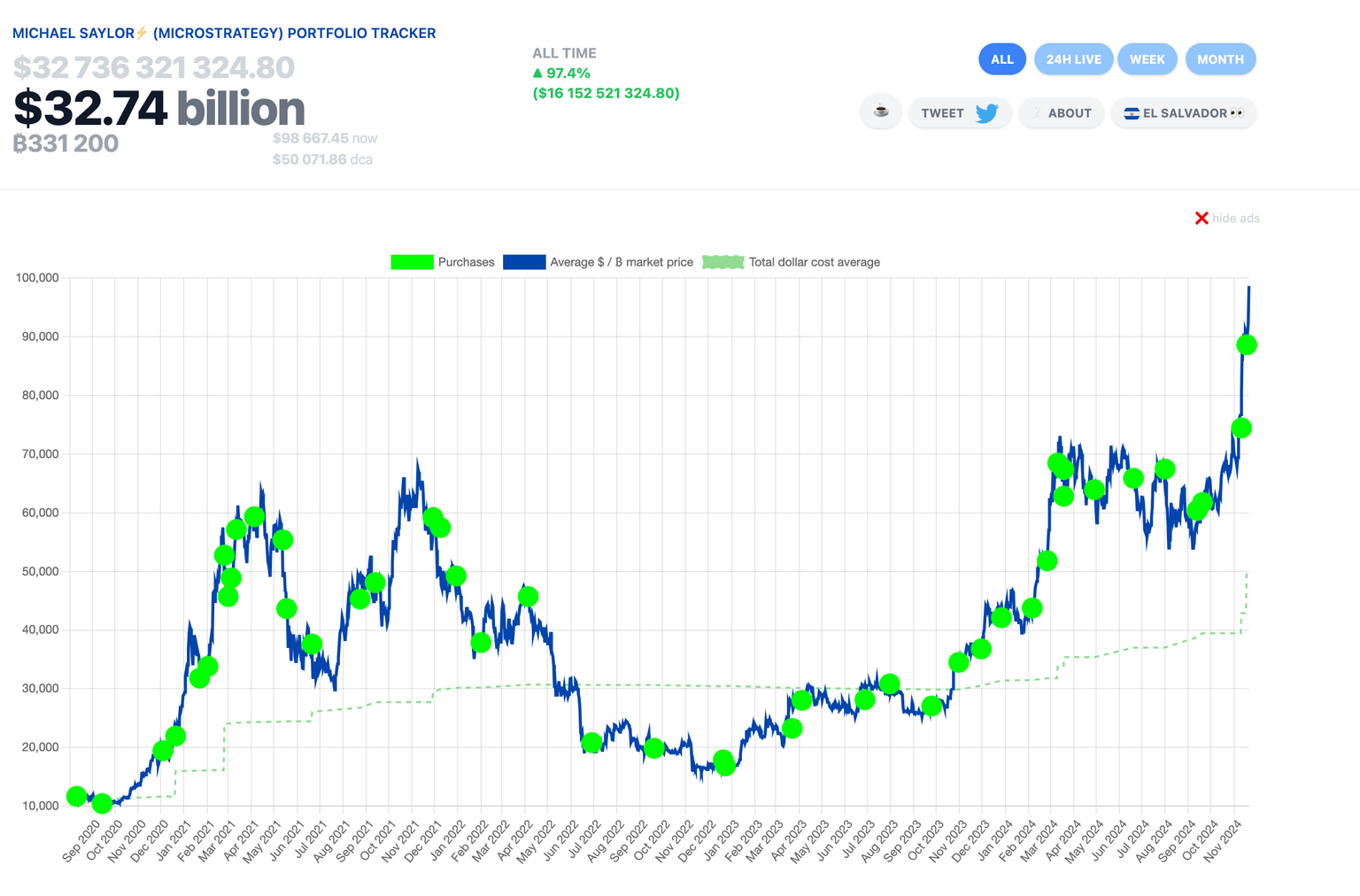 At press time on November 21, MicroStrategy now holds a total of 331,200 BTC worth approximately $32.7 billion, with 97% unrealized gains.