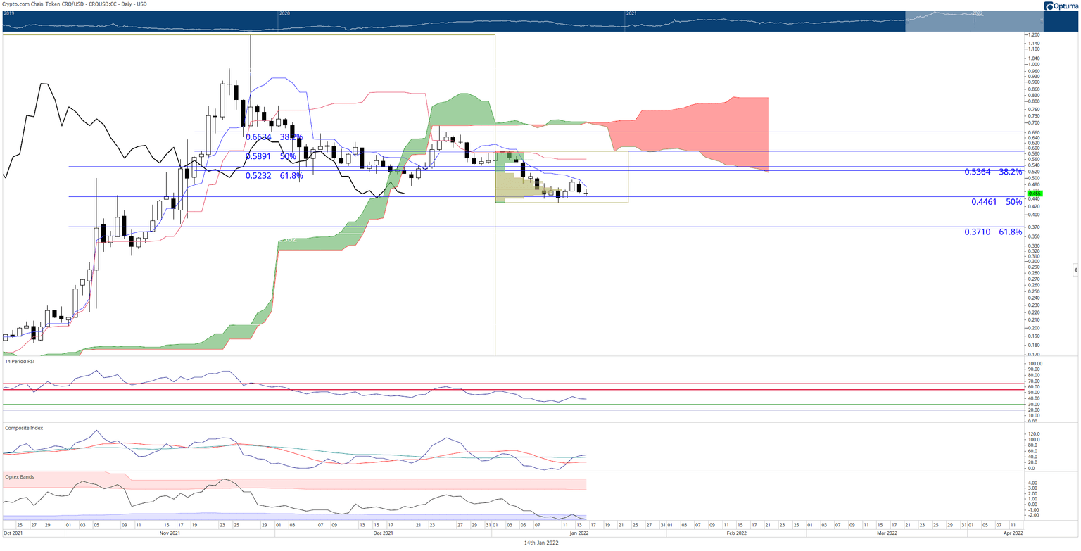 The 50% Fibonacci retracement at $0.445 continues to be the primary support zone for CRO price. Failure to hold support at $0.445 would likely push Crypto.com down to $0.37, where a high volume node and the 61.8% Fibonacci retracement exist. The Relative Strength Index and Composite Index oscillators support a downside move, but the Optex Bands oscillator does not. The Optex Bands oscillator is at extreme oversold conditions – but that is the only oversold variable present.