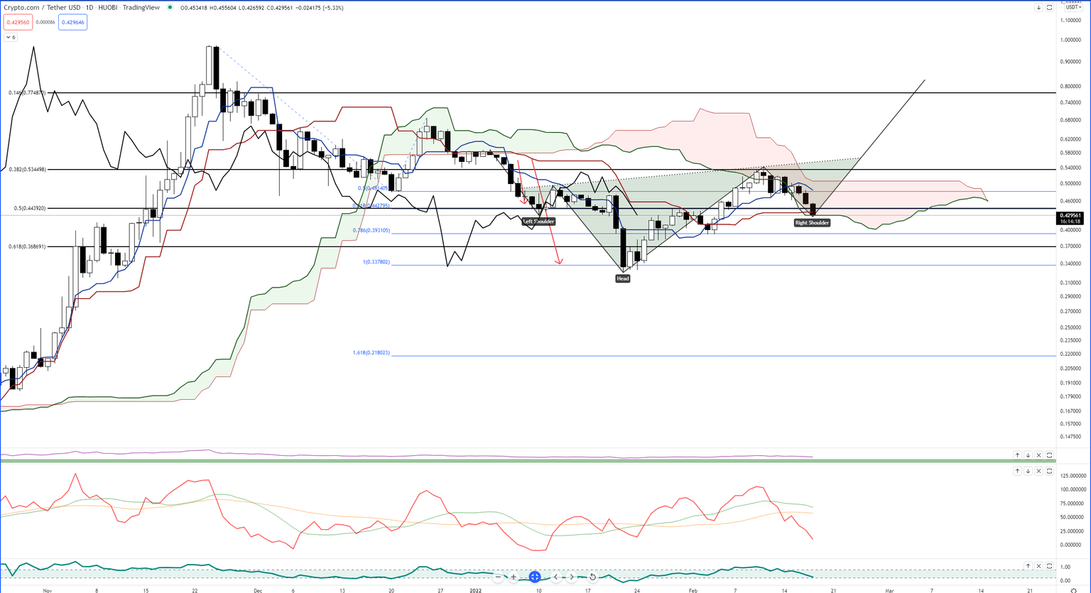 Bears were able to push CRO into a strong support zone in the $0.43 to $0.45 value area. That support zone is made up of the 61.8% Fibonacci extension ($0.44), 50% Fibonacci retracement ($0.45), daily Kijun-Sen ($0.43), and the bottom of the daily Ichimoku Cloud ($0.43). Support is likely to hold in this zone.