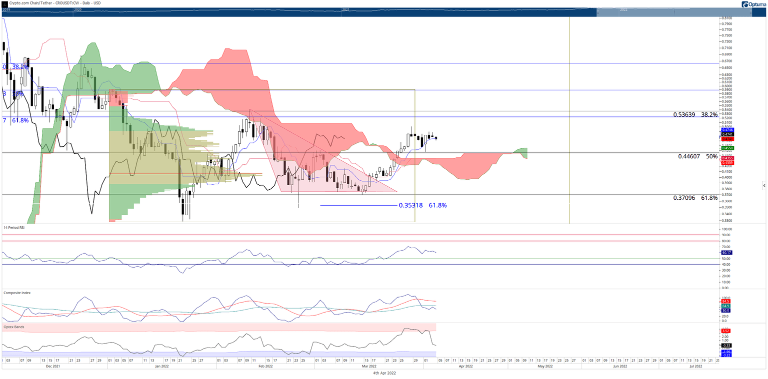 The most important support level for Crypto.com price to remain above is the 61.8% Fibonacci retracement at $0.37. Failure to hold that level would likely trigger a substantial collapse towards the $0.20 value area. While a move that extreme is not likely to occur, geopolitical unknowns and Crypto.com's exposure to possible regulatory hawks could trigger substantial whipsaws.
