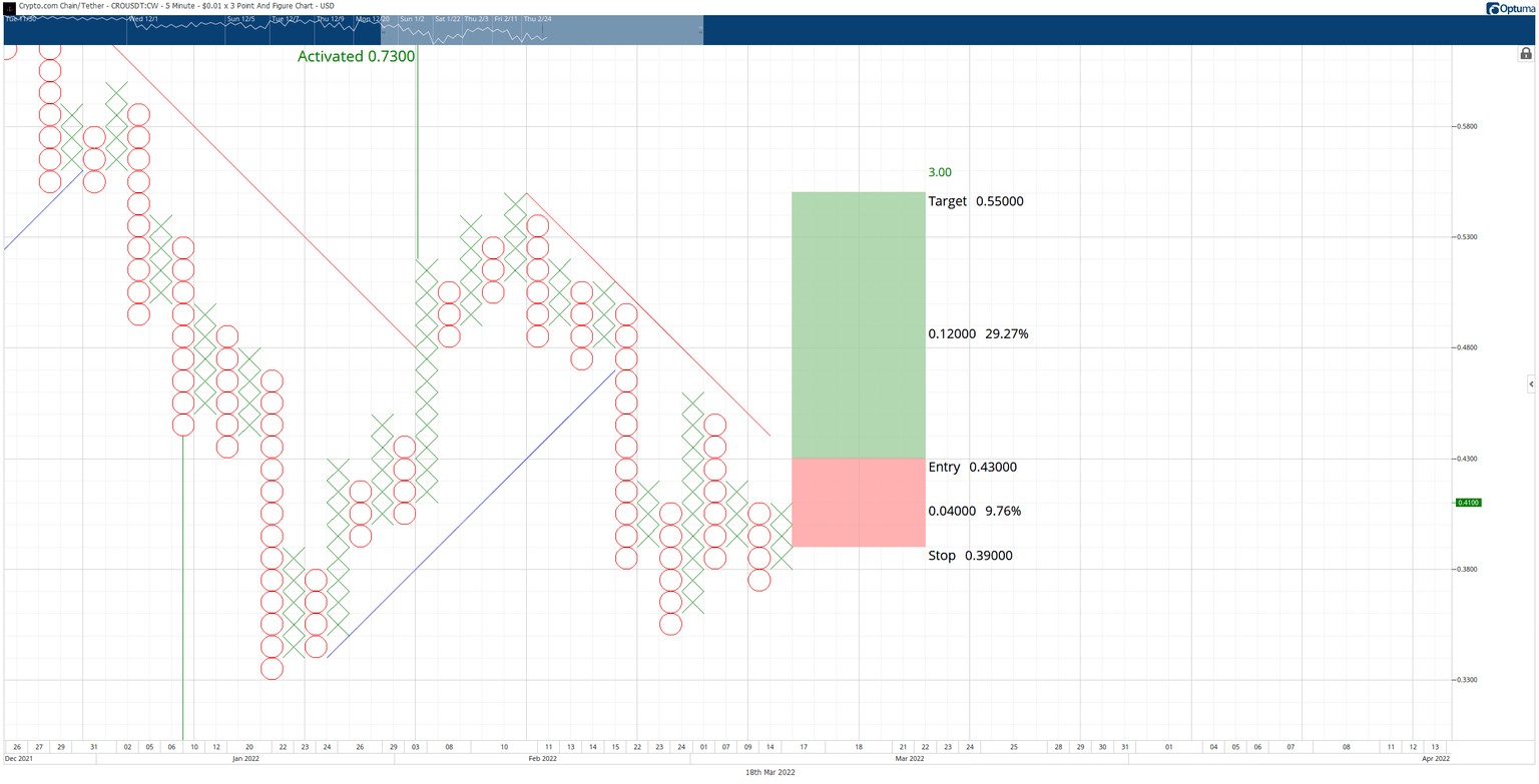 There is a hypothetical long trade idea for Crypto.com present on the $0.01/3-box reversal Point and Figure chart. The setup is a buy stop order at $0.43, a stop loss at $0.39, and a profit target at $0.55.