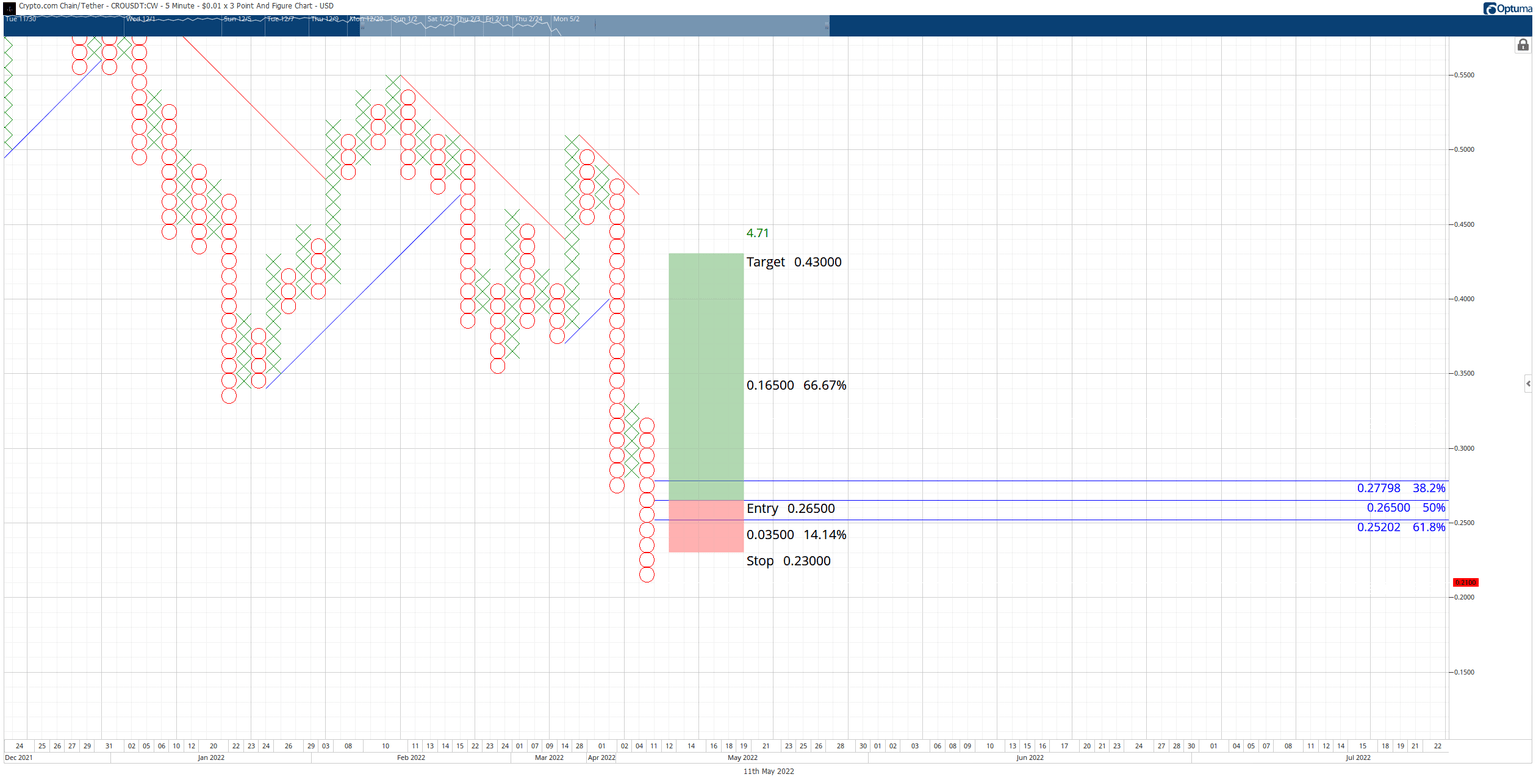 The combination of the Ichimoku time and price levels with the extreme oversold conditions in the oscillators complement a strong buy setup on the Crypto.com Point and Figure chart.