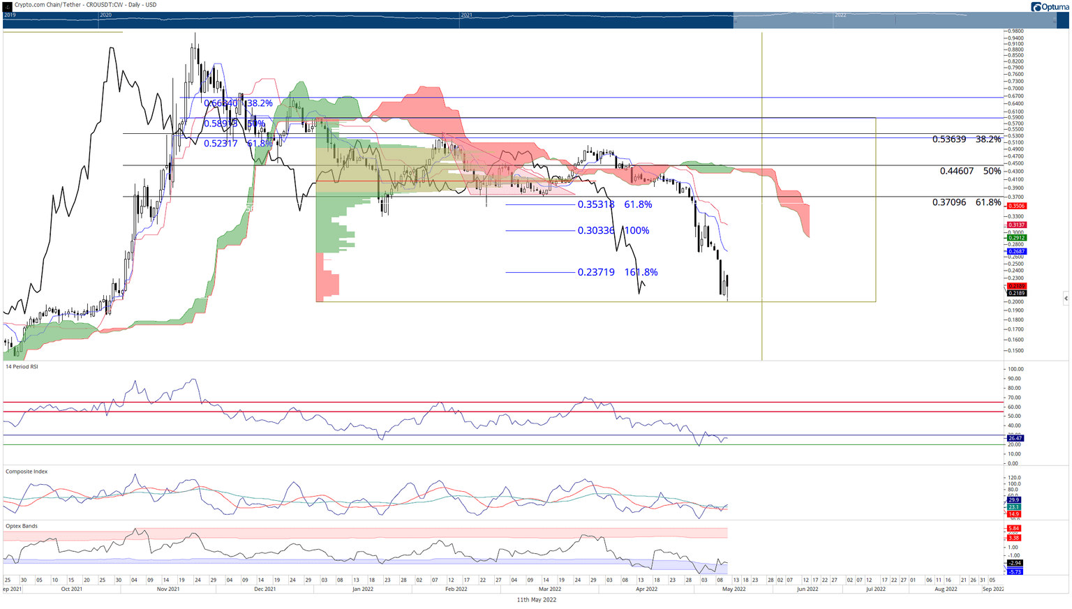 Additionally, the oscillators for Crypto.com price are extremely oversold. The Optex Bands have just moved out of historical all-time lows. Likewise, the Relative Strength Index and the Composite Index show regular bullish divergence at extreme lows.