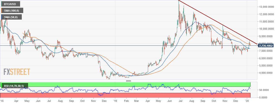 The surge in Bitcoin price hit a snag on touching a strong resistance line. The descending trendline commenced after BTC hit highs around $13,800 in June 2019. Its impact on recovery cannot go unnoticed and is likely to continue limiting the advances made by the bulls.