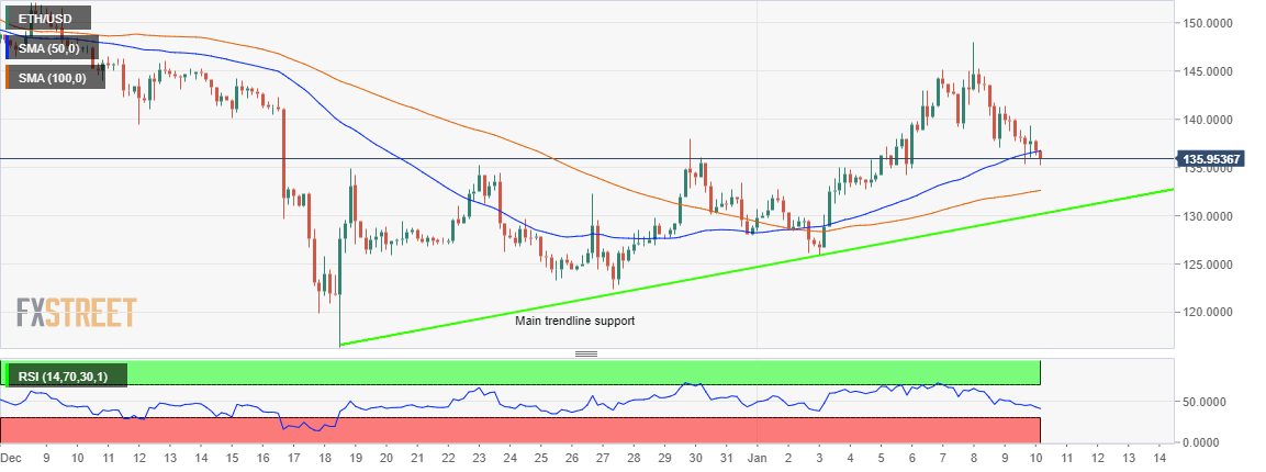 Ethereum is struggling to stay above the support at $135 after losing 1.5% of its value on Friday. The price has also corrected under the 50 SMA on the 4-hour chart. The RSI signals that the downward momentum is here to last, besides ETH/USD is not oversold. On the other hand, the main trendline support is in line to offer support if losses grind towards $130.