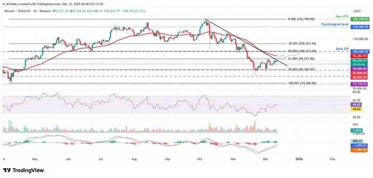 Bitcoin price was rejected at the 61.8% Fibonacci retracement level at $94,253 (drawn from the April low of $74,508 to the all-time high of $126,199 set in October) on Wednesday and declined slightly that day. However, on Thursday, BTC rebounded after retesting its $90,000 psychological level. At the time of writing on Friday, BTC hovers at around $92,000.