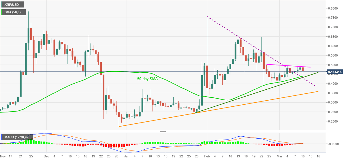 XRP/USD fails to keep the sellers on board, despite recent declines, as the quote firms up around mid-$0.4600s during early Thursday. The altcoin took a U-turn from a two-week-old resistance line the previous day but couldn’t extend the losses to even the nearest support, namely the 50-day SMA.