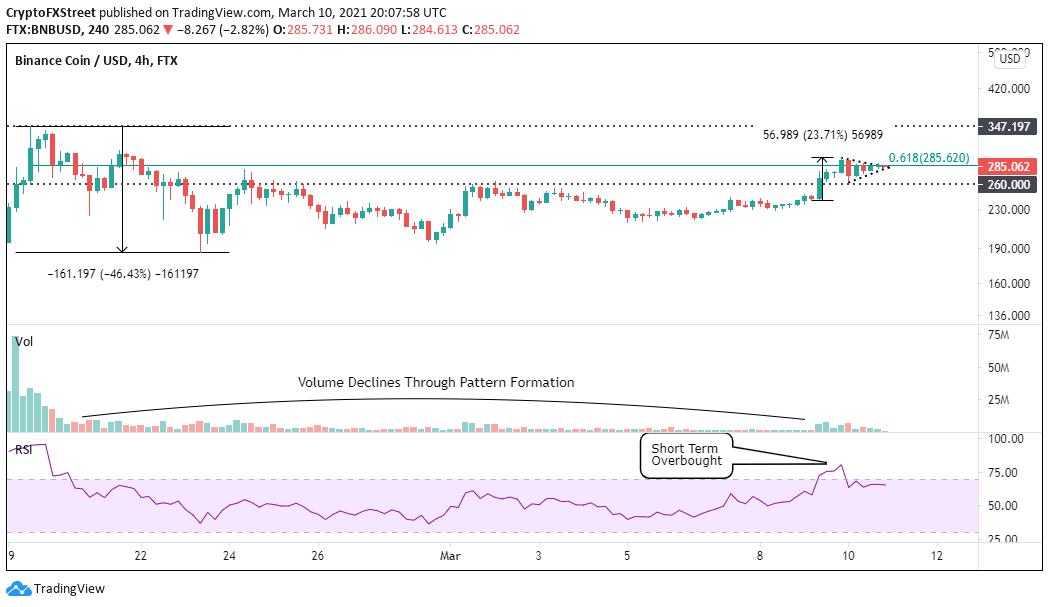 From February 19 to February 23, BNB declined over 45%. The price action since has been constructive, with the volume profile showing no further distribution before its explosive reaction to the staking news. The native coin of the Binance Chain, BNB, has many use cases, including driving on-chain transactions, paying for transaction fees on Binance Exchange, and making in-store payments, to name a few.