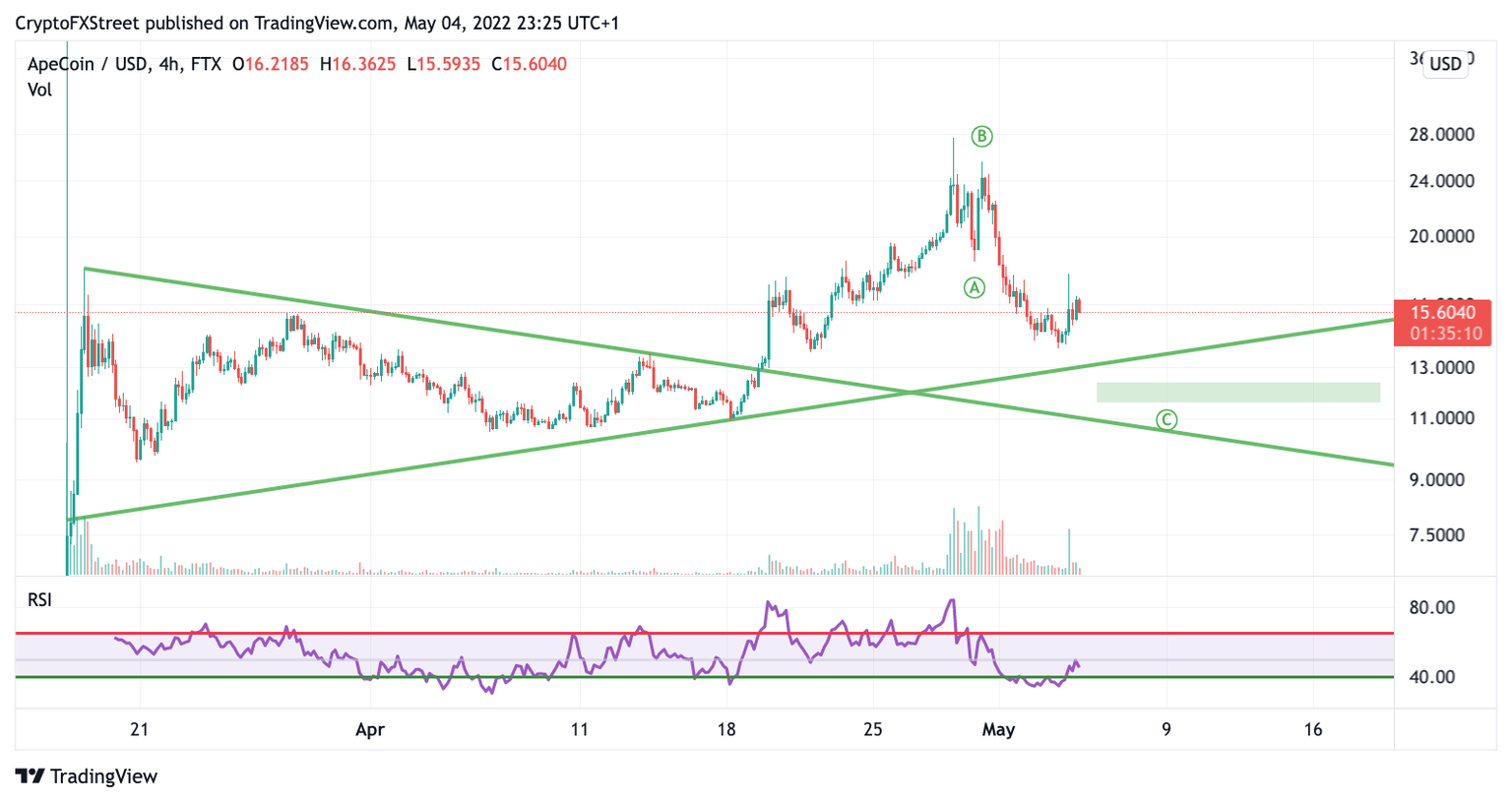 Apecoin price has disproportionate wave structure. One more drop could occur into $12. ApeCoin price has rallied 20% into today's high at $17.66. Despite the impressive countertrend rally, the overall downtrend looks disproportionate. The consolidations between each downslide are too similar to qualify as separate impulse waves.