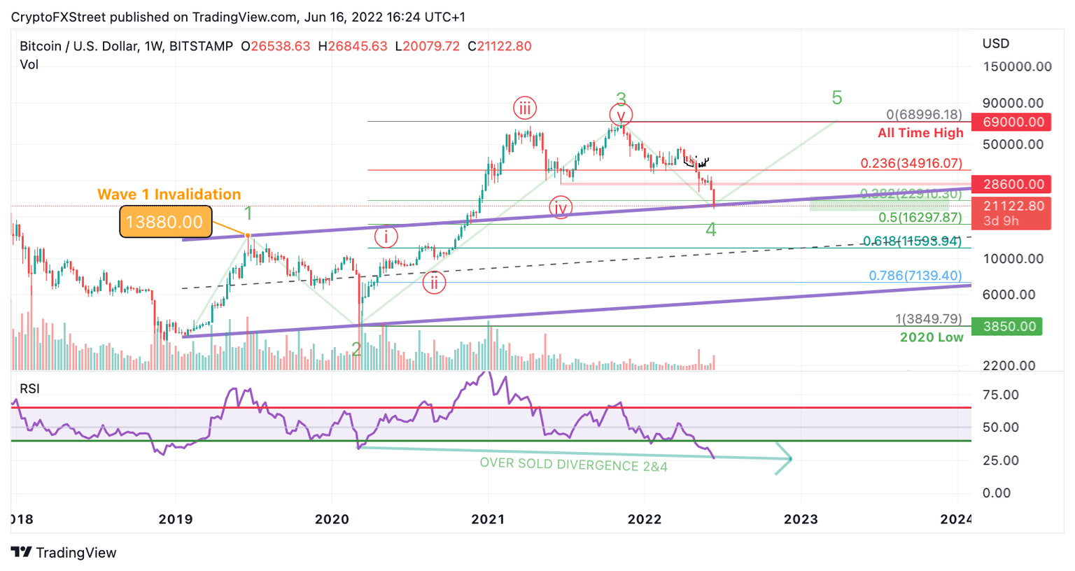 Bitcoin price has triggered an unprecedented levell of fear in the market according to the Fear and Greed Index. BTC price now shows RSI divergence between two significant levels, which confounds one more bull-run will occur. Invalidation of the macro bullish count is a breach at 13,880.