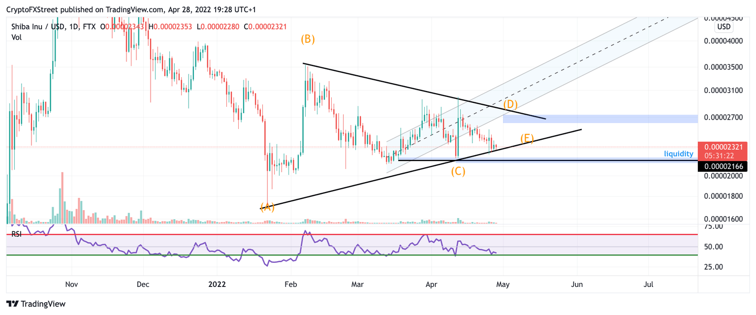Shiba Inu price has given reasons to believe in a 17% uptrend rally in the coming days. The SHIBA price appears to be coiling into a triangle pattern, having printed 3 of the 5 necessary swings. Analyzing the technicals, waves A, B, fit textbook triangle criteria as they display choppy and sometimes unpredictable directional changes.