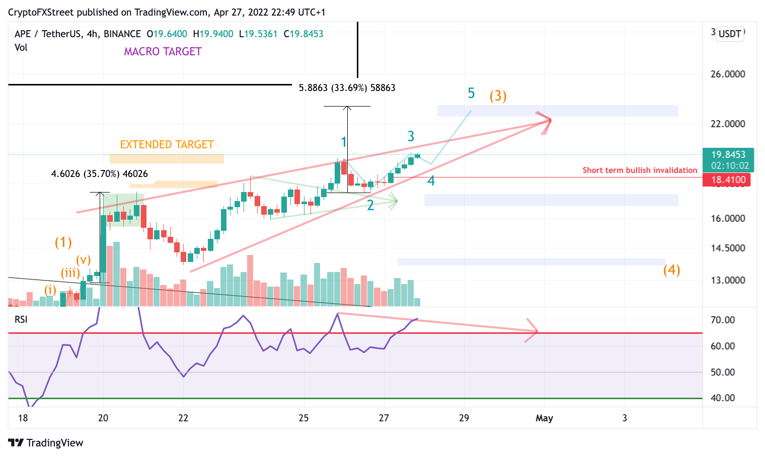 ApeCoin price is still headed north, but the technicals should be analyzed thoroughly to maximize potential profit. ApeCoin price is currently trading at $19,80. Traders should expect a slight pull back into the $19.40 zone before an additional run-up towards $23.