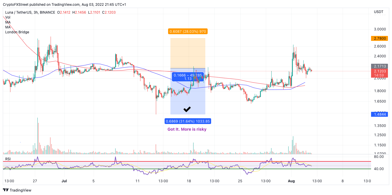 Terra's LUNA price could begin a charge towards $2.70 liquidity levels. FXStreet subscribers may recall the liquidity zone as it was successfully utilized in a bearish trade idea forecasted on July 6. The uptrend scenario depends on $1.61 holding as support.