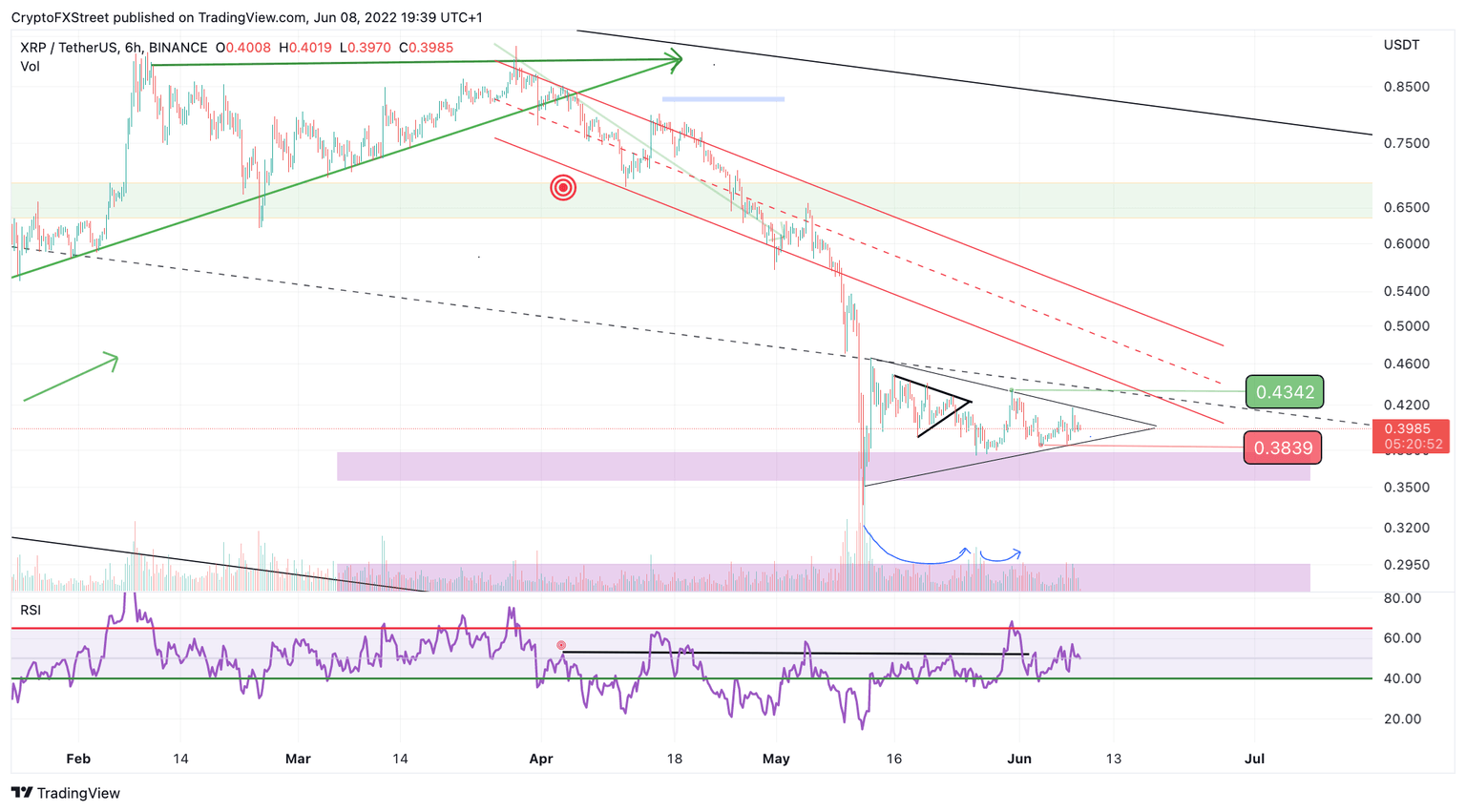 XRP price coils in triangular fashion which explains the unpredictable price action during May. A breach below $0.3839 could trigger a 25% decline to $0.31. Invalidation of the bearish thesis is a breach above $0.4342, which could trigger a 25% rally towards $0.51.