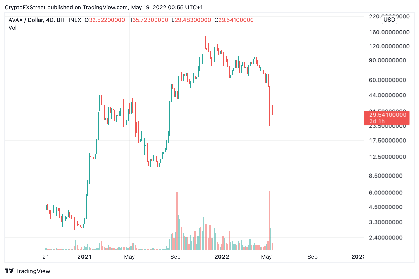 Avalanche price could be setting up an explosive move to the downside aiming for targets most investors would call impossible. Avalanche price displays reasons to consider a significant macro sell-off underway. The AVAX price currently trades at $30, which is the settling price of the initial sell-off on May 9.