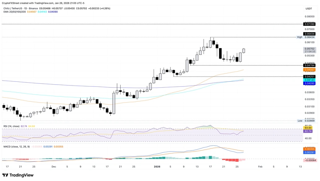 Chiliz rebounds from the $0.050 psychological level at the start of this week, signaling a fresh recovery. At the time of writing, CHZ is up over 4% on Tuesday, extending the 10% gains from Monday. The recovery in CHZ would likely test the $0.064 peak from January 17, and a decisive close above it would open the door toward the $0.073 level, marked by the December 20 low.