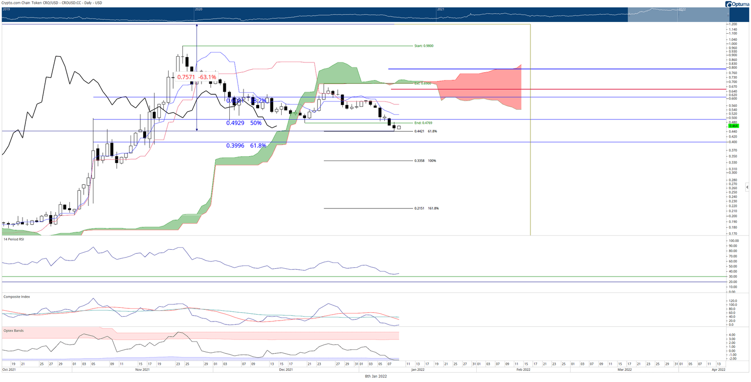 Crypto.com price experiences a strong bounce after hitting a critical Fibonacci expansion zone. However, whether the bounce will yield a resumption of the prior uptrend is not yet known. Critical resistance levels are to be tested before any confirmation of a new uptrend can occur.