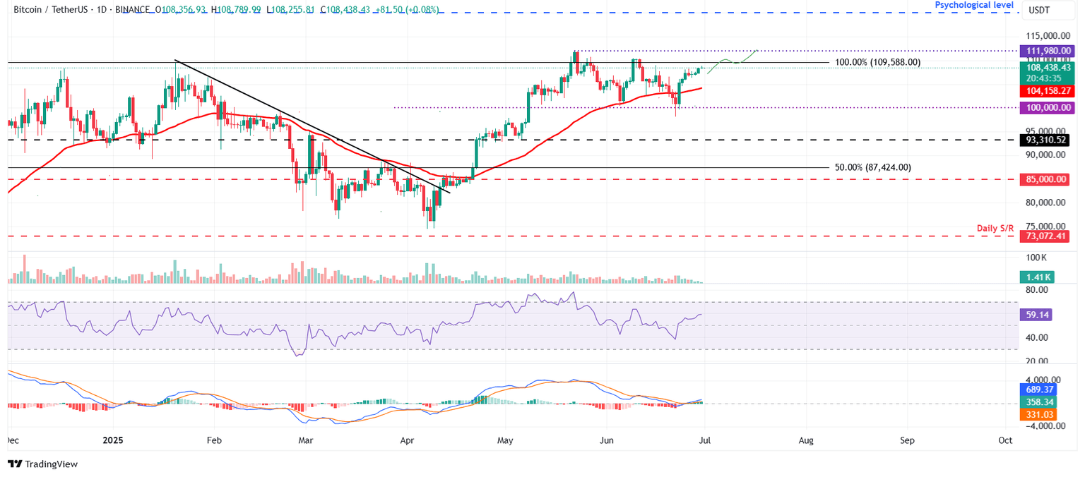 Bitcoin price rose sharply by 7.32% last week, closing above $108,000. At the time of writing on Monday, it hovers at around $108,500. If BTC continues its ongoing rally, it could extend toward the May 22 all-time high at $111,980. A successful close above this level could extend additional gains to set a new all-time high at $120,000.