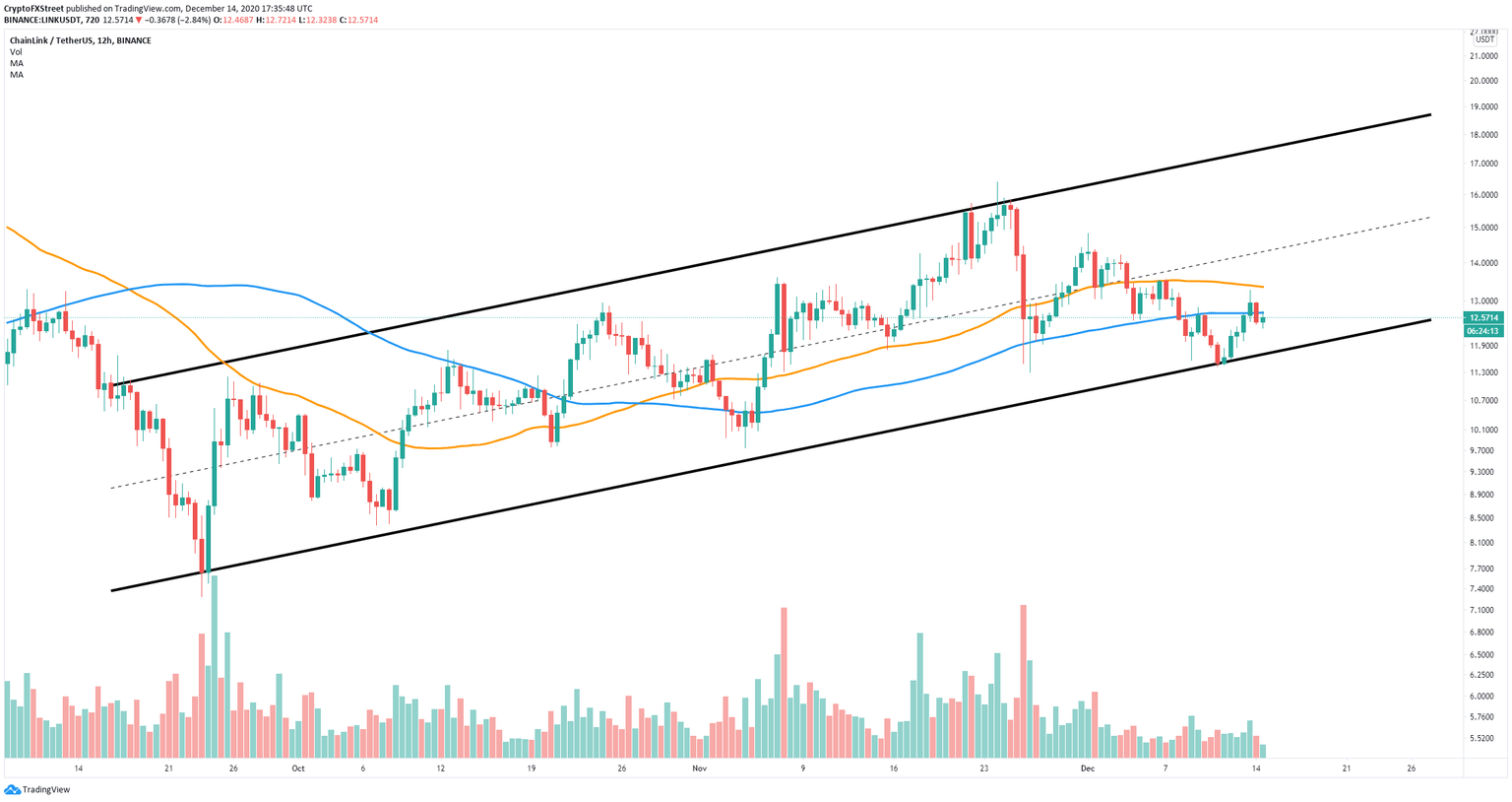 After a significant blow on August 16 from its all-time high at $20.11, Chainlink has tried to bounce back up since September 23. The digital asset continues trading inside an ascending parallel channel on the 12-hour chart. On December 11, Chainlink price touched the lower trendline of the ascending parallel channel, around 11.50.
