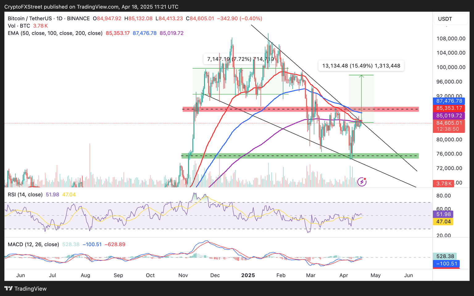 Bitcoin (BTC) price consolidates above $84,000 on Friday, a short-term support that has gained significance this week. The world's largest cryptocurrency by market capitalization continued to weather storms caused by United States (US) President Donald Trump's incessant trade war with China after pausing reciprocal tariffs for 90 days on April 9 for other countries. Bitcoin exchanges hands at $84,605 at the time of writing on Friday, with its technical structure suggesting that a breakout may soon be imminent.