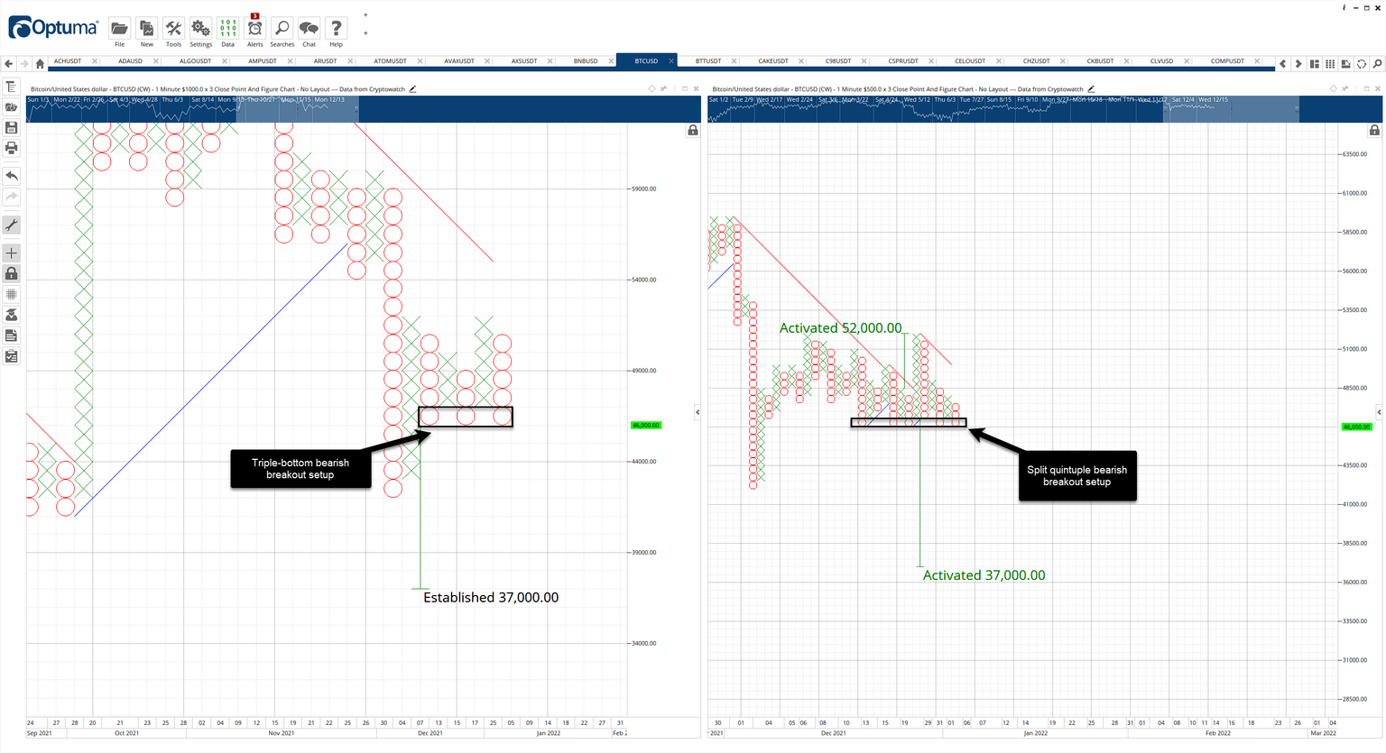 Bitcoin price action shows that some very bearish price action may be coming up soon. Both the Japanese candlestick charts and two Point and Figure charts show dangers to the downside – but follow-through by sellers is necessary and has yet to happen.
