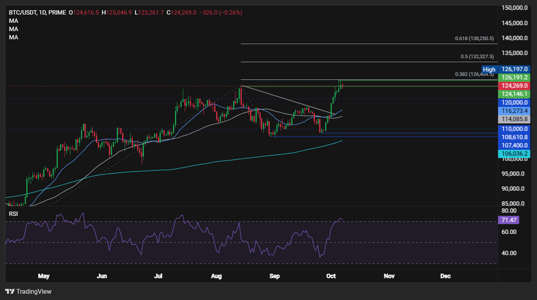 Bitcoin extended gains to a record high of 126.1k yesterday, before easing back to 124k at the time of writing. Other major altcoins have also experienced strong rallies, with Ethereum and Solana gaining 13% over the past 7 days and BNB jumping 27%.