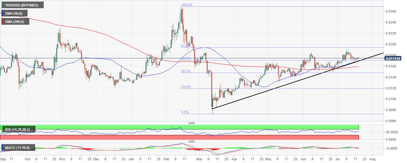 Tron has tried to join the altcoin frenzy in July where some tokens such as Tezos, Stellar and Chainlink have rallied exceptionally. In the first and second weeks of the month, TRX/USD surged from the key 38.2% Fibonacci retracement level support in June to highs of 0.0192.