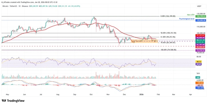 Bitcoin price recovered slightly, closing above the midpoint of a horizontal parallel channel at $87,787 on Monday, after a 7.48% correction last week. BTC continued its recovery on Tuesday, finding support around the midpoint level. At the time of writing on Wednesday, BTC is trading at $89,300. If the $87,787 continues to hold as support, BTC could extend the rally toward the upper boundary of the horizontal pattern at $90,000.