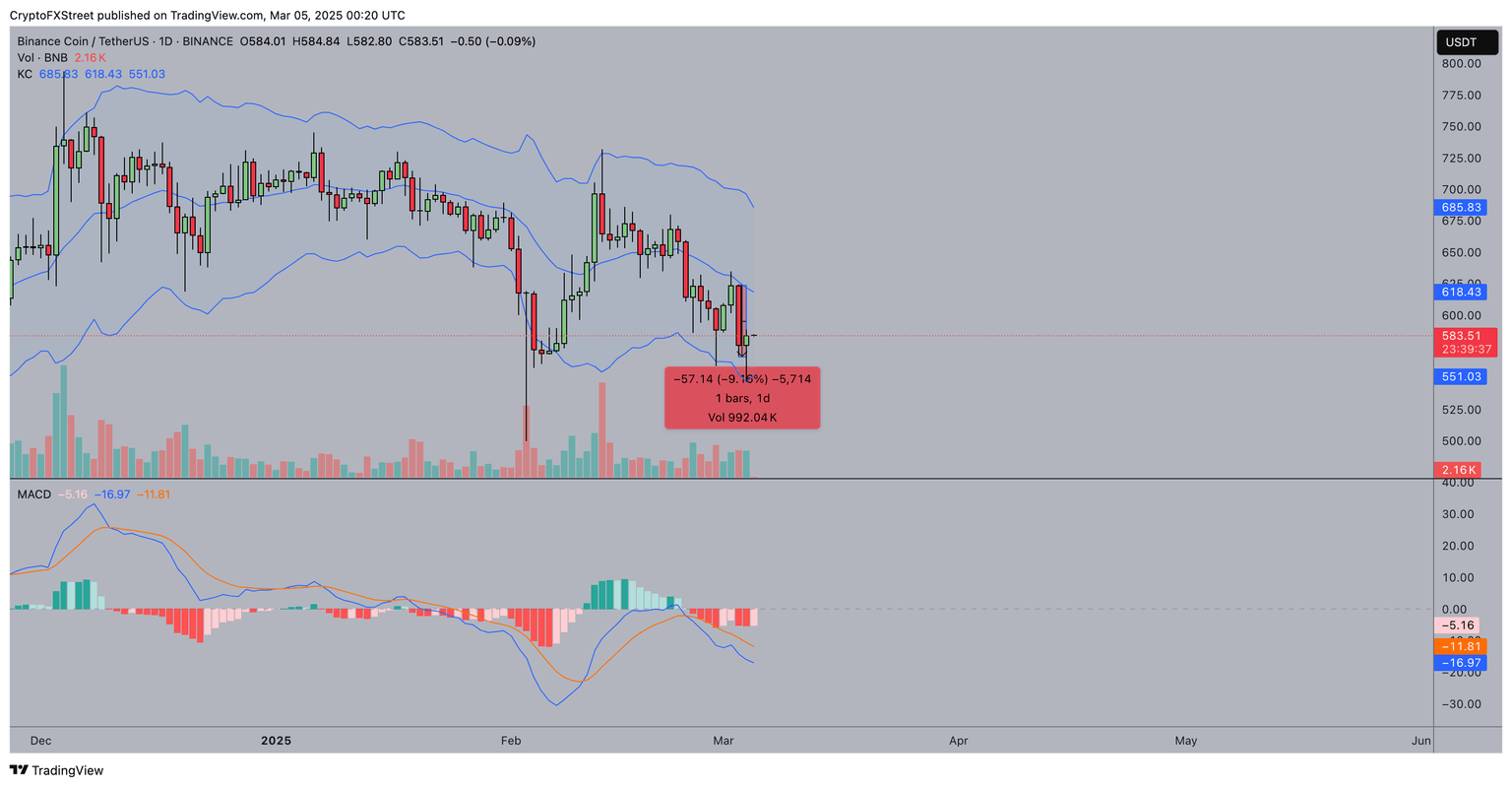 Binance Coin (BNB) price stabilized at $560 on Tuesday, with its 9% decline representing the lowest losses among the top five crypto assets. Rising trading volumes appear to be cushioning the impact of negative market sentiment following Trump’s decision to exclude BNB from the newly established Crypto strategic reserve.
