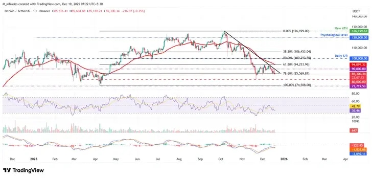 Bitcoin was rejected at the psychological $90,000 resistance on Monday but found support at the 78.6% Fibonacci retracement at $85,569, leading to consolidation between these levels until Wednesday. However, on Thursday BTC declined and closed below the $85,569 level. At the time of writing on Friday, it trades around $85,300. If BTC continues its downtrend, it could extend the decline toward the psychological $80,000 level.