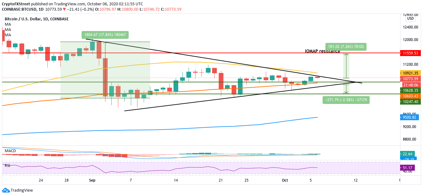 The relative strength index (RSI) for the flagship cryptocurrency is trending around the midline as BTC's supply and demand keep canceling each other out. If the price has a bearish breakout from the triangle, it will fall to the $10,600 support line, which should absorb most of the selling pressure (further explained in the IOMAp section).