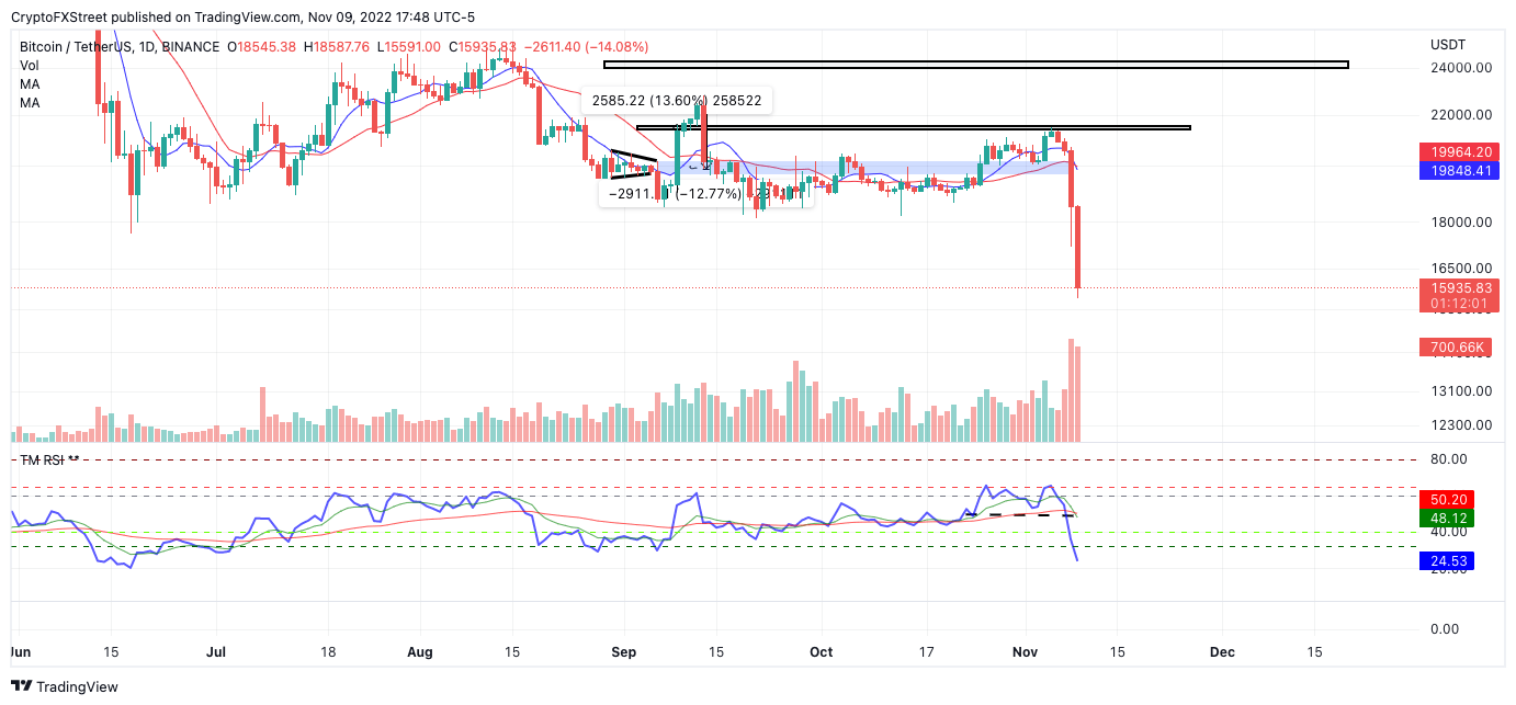 Bitcoin price free falls, bringing the market value down by 25% on the month at $21,000 as the bears have forged a weekend sell-off. $679 million worth of longs have been liquidated in the last 24 hours. Invalidation of the bearish thesis is a breach above.