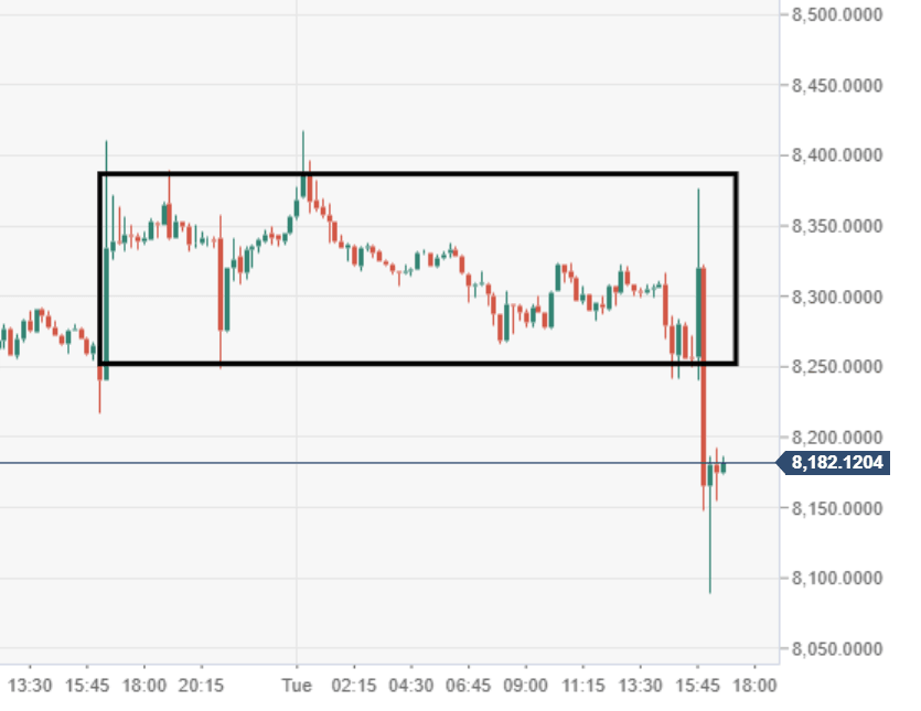 BTC/USD was trading within tight conditions, downside at $8,250, with upside capped at $8,400. Given the fresh near-term wave of selling pressure through the support, it does leave the door open to a further bear attack.