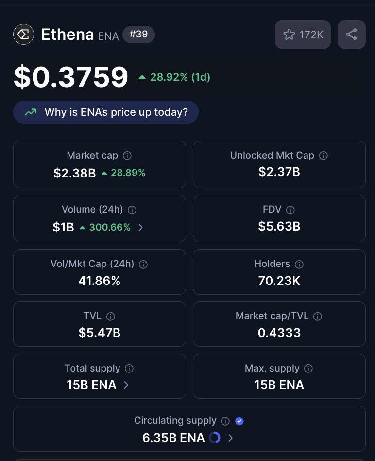 Ethena (ENA) edges higher by 20% at press time on Friday, printing its fourth consecutive bullish day. The surge in buying pressure could be triggered by the increased volumes from the Korean market after the Upbit listing on Friday.