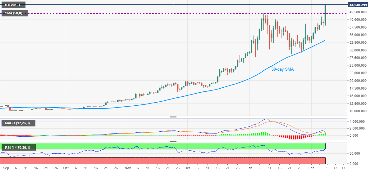 Bitcoin bulls are unstoppable around $45,000, following its run-up to $45,064 latest, while refreshing the all-time high on earely Tuesday. The BTC/USD rallied heavily on Monday after Tesla announced that it had previously bought $1.5 billion worth of Bitcoins, pushing the price to update historical highs of $43K.