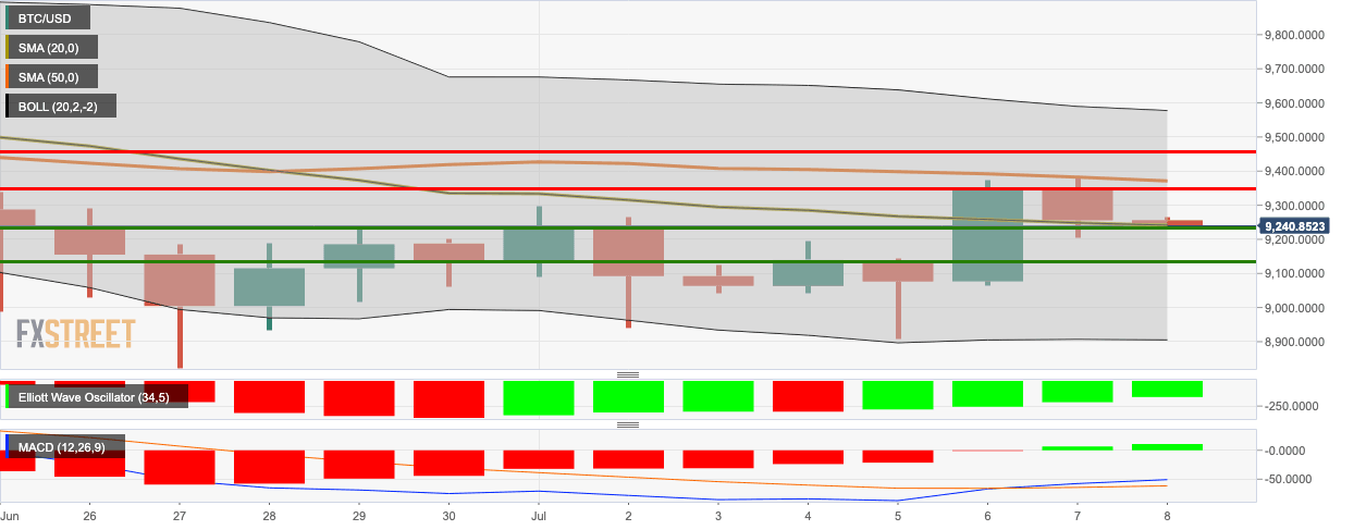 BTC/USD dropped from $9,255.80 to $9,255.15 as the bears remained in control for the second straight day. Currently, the price is sitting on top of the SMA 20 curve. The Elliott Oscillator has had four consecutive green sessions, while the MACD shows that market momentum is presently bullish.