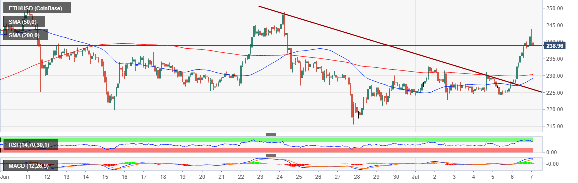 Ethereum price broke out of the consolidation witnessed in the first week of July between the key support at $225 and the resistance at $230. Boosting the price action above $235 and $240 was the momentum from overcoming the resistance at the 200 SMA in the 4-hour chart.