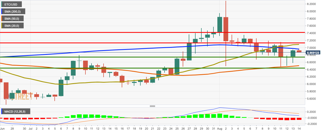 ETC/USD faced bearish correction following two straight bullish sessions. The price dropped from $6.925 to $6.889. The moving average convergence/divergence (MACD) shows sustained bearish market momentum. There are four strong resistance levels at $6.96 (SMA 200), $7.09 (SMA 20), $7.143 and $7.41.