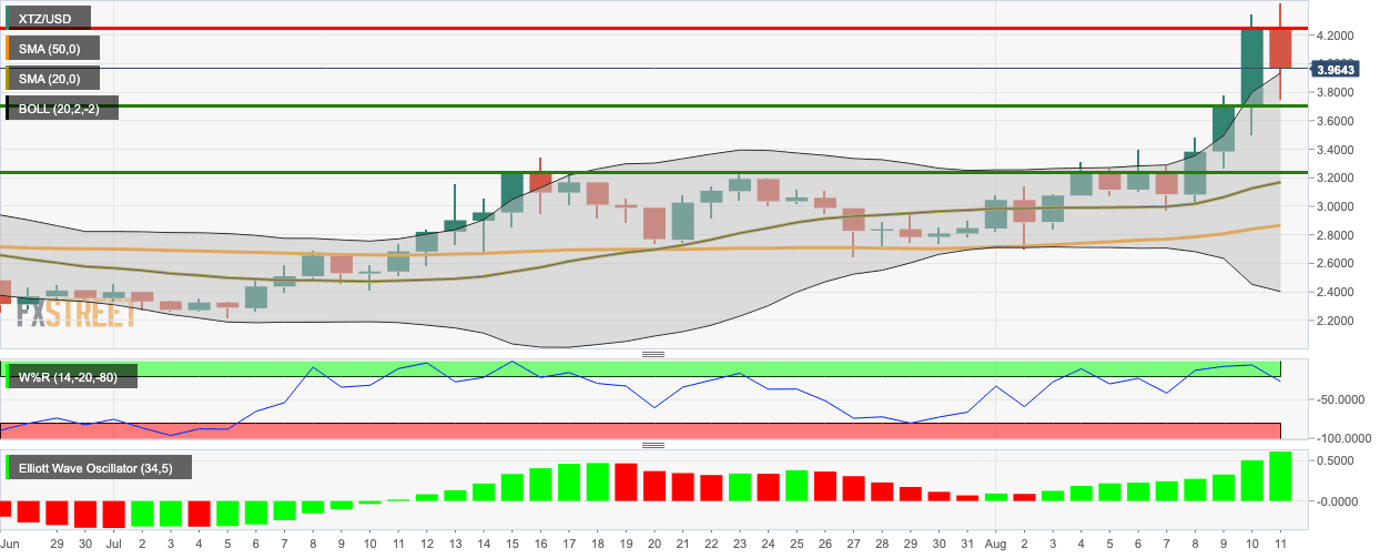 XTZ/USD faces bearish correction following three straight bullish days. The price has gone down from $4.257 to $3.97 and is presently sitting above the 20-day Bollinger Band. The Elliott Oscillator has had nine straight bullish sessions of increasing intensity.