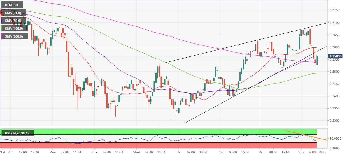 IOTA (IOT/USD) stalls the sharp sell-off to 0.2515, as the bears take a breather before the next push lower. As observed on the hourly chart, the coin came under fresh selling pressure from near 0.2670 region after a death cross got confirmed early Sunday.