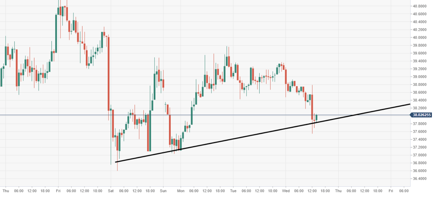 Bitcoin is looking bearish on Wednesday as the price moved 3% lower after rejecting higher levels. The market bounced off the blue trendline and pushed through the 55 and 200 hourly moving averages. This all points to a very bearish picture on the intraday timeframes. The RSI has also dipped under the 50 mid-line to compound the misery but is in an oversold zone so there could be a short term bounce.