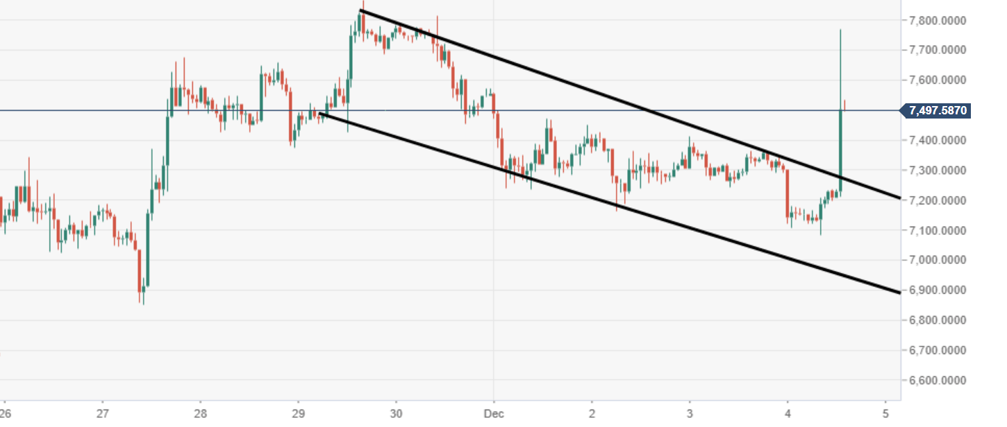 There is a chunky barrier of resistance seen at $7500, in proximity to the lower of the noted flag.