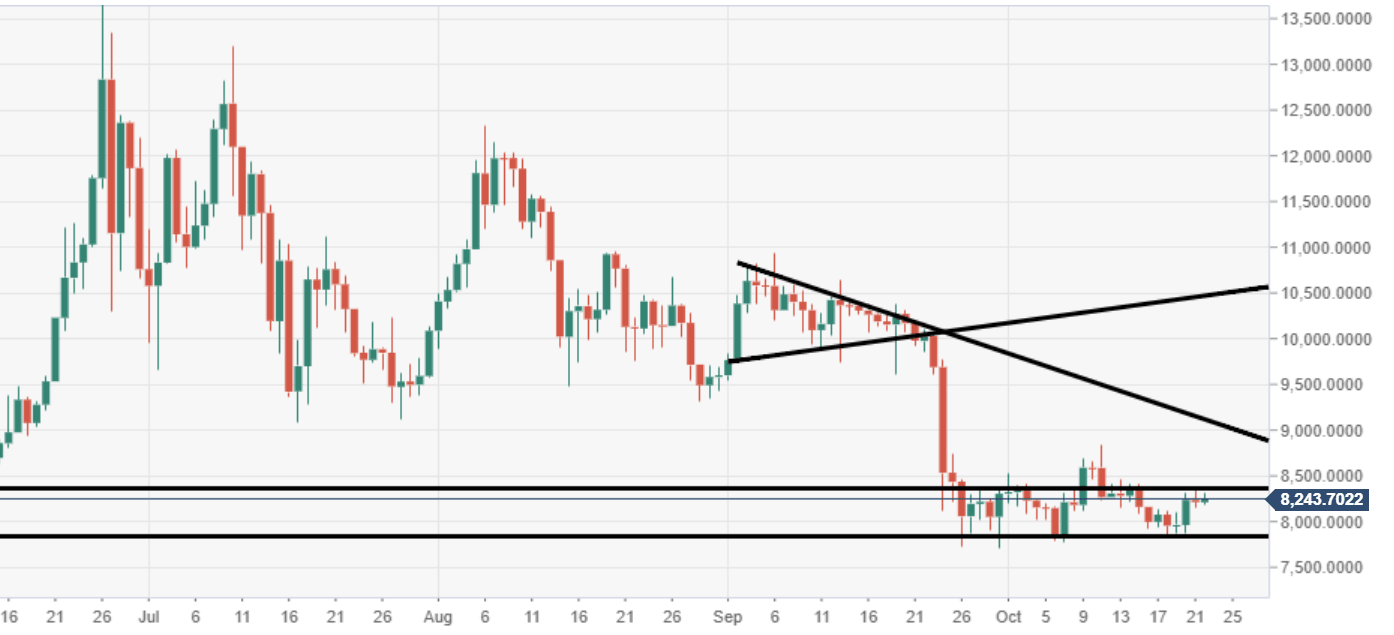 BTC/USD continues to move within the confinements of a bearish flag structure via the daily chart view.