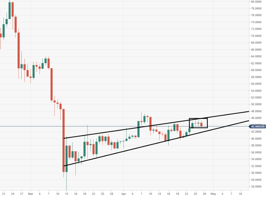 Litecoin price is trading in positive territory by 3.35 % in the session on Monday. LTC/USD narrowing has been observed as the price consolidates. There is a critical area of resistance just ahead at $45-46, a gateway for the $50 return.