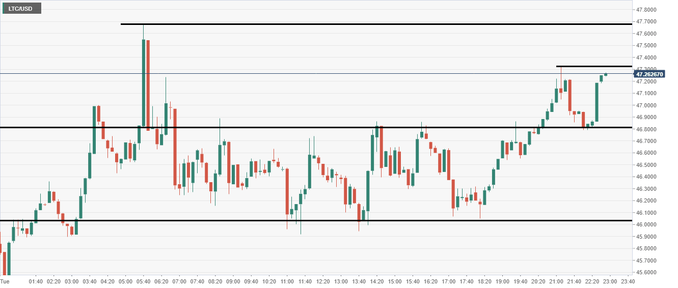 The Litecoin 10-minute chart is looking to break out of the intrasession highs at 47.64. It has been a slow day in the crypto space and toward the end of the GMT day prices have pushed higher.